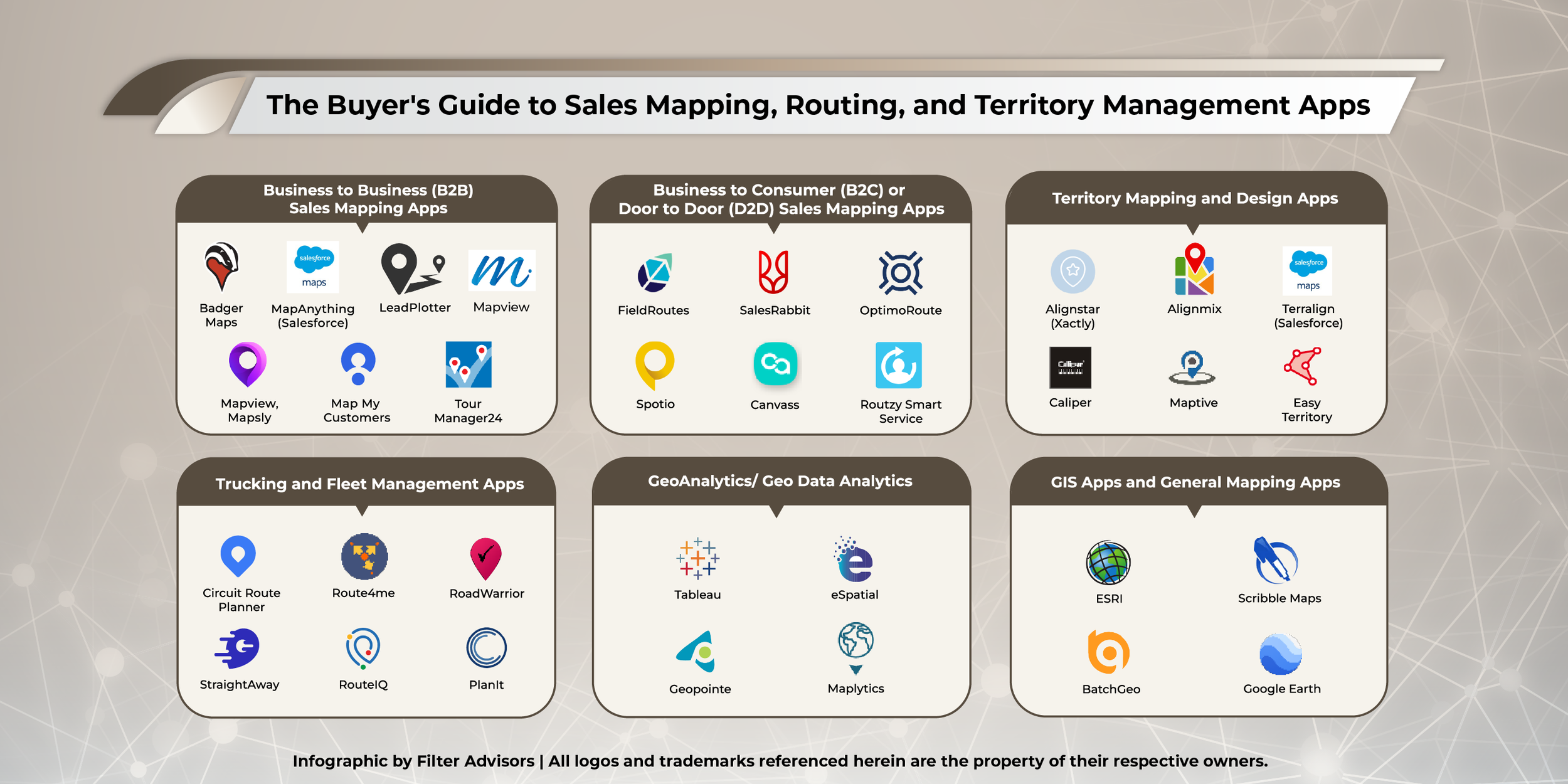 We decided to compile a Buyer’s Guide to clear up this confusion and to help Sales Teams get where they wanted to go. There is not one App that fills every sales mapping need, so sales teams need to figure out which apps from which categories will help them the most.