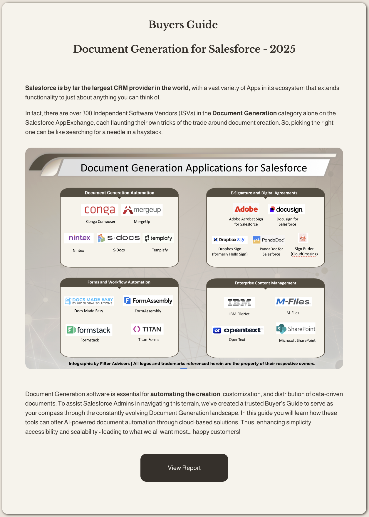 Document Generation software is essential for automating the creation, customization, and distribution of data-driven documents. To assist Salesforce Admins in navigating this terrain, we've created a trusted Buyer’s Guide to serve as your compass through the constantly evolving Document Generation landscape. In this guide you will learn how these tools can offer AI-powered document automation through cloud-based solutions. Thus, enhancing simplicity, accessibility and scalability - leading to what we all want most... happy customers!