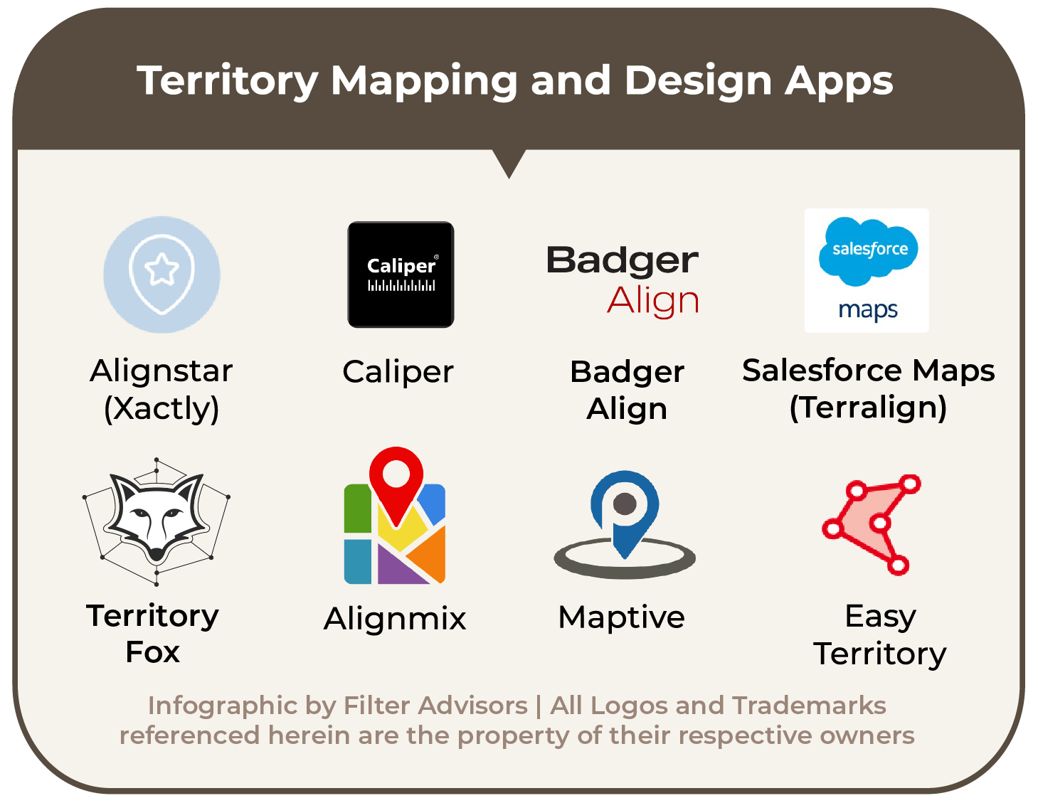 | Territory Mapping and Design Apps | Designs, balances, and creates sales territories. | Sales Operations or Sales Management | Beverages, Healthcare, Pharmaceuticals, Chemicals, CPG, Manufacturing, Tires, Software, Hardware | “The SalesOps team built out the territories, figured out the compensation plan, and assigned the accounts to the Sales Team using a Territory Mapping App.” |